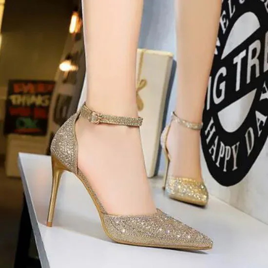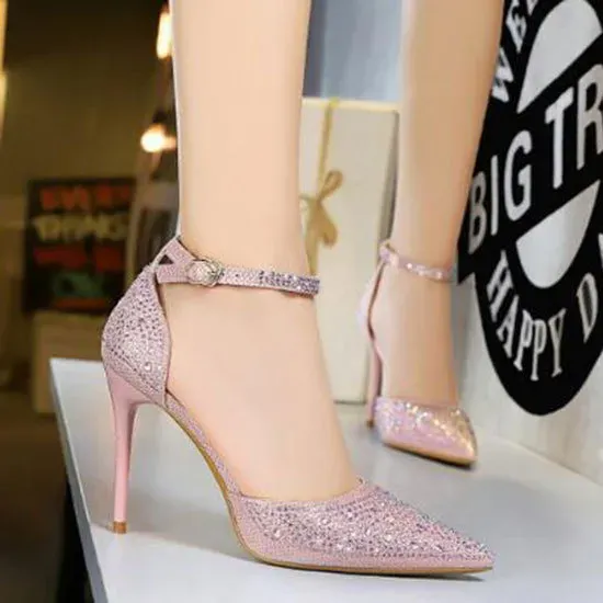 Size 4.5-8.5 Women Sweet Shiny Rhinestone Decor Buckle Ankle Strap Pointed Toe Stiletto Sandals Shoes