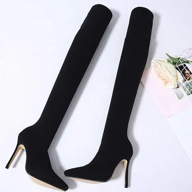 Size:4.5-10 Women Fashion Solid Color Pointed Toe Over The Knee High Stiletto Heels Boots