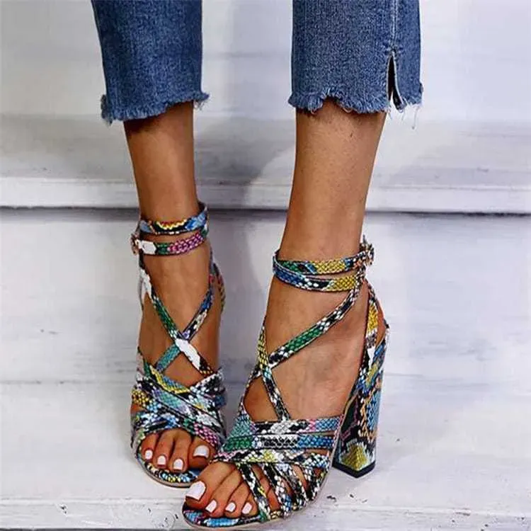 Size:4.5-11 Women Multicolor Snakeskin Printed Open Toe Block Heel Sandals