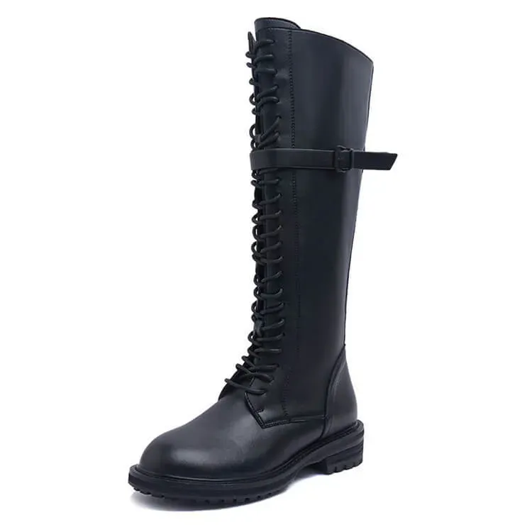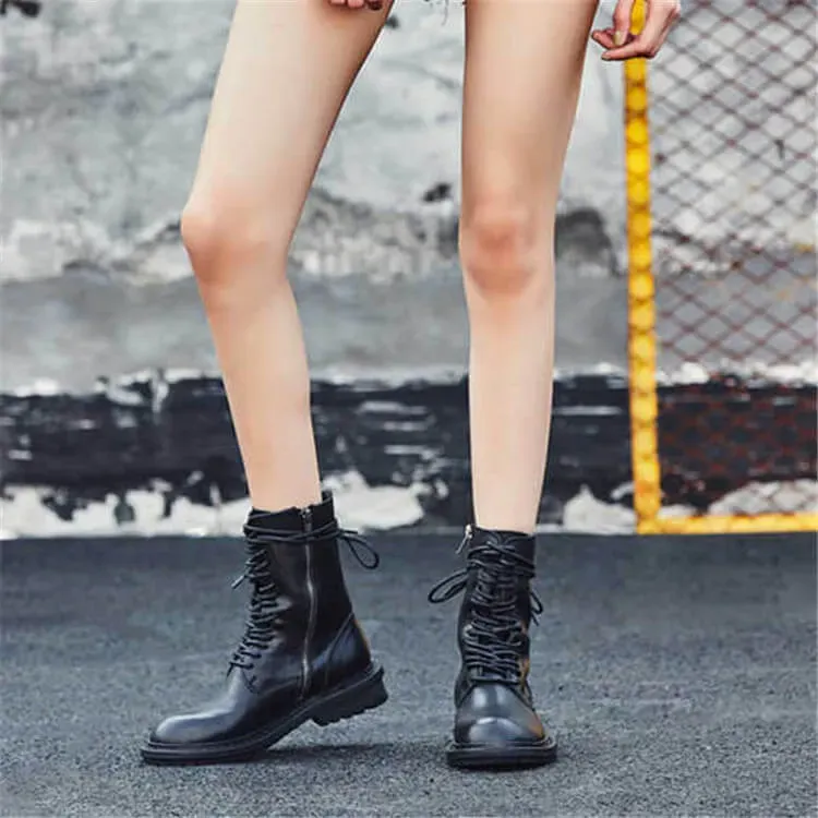 Size:4.5-9 Women Solid Color Lace-up Genuine Leather Zipper Boots