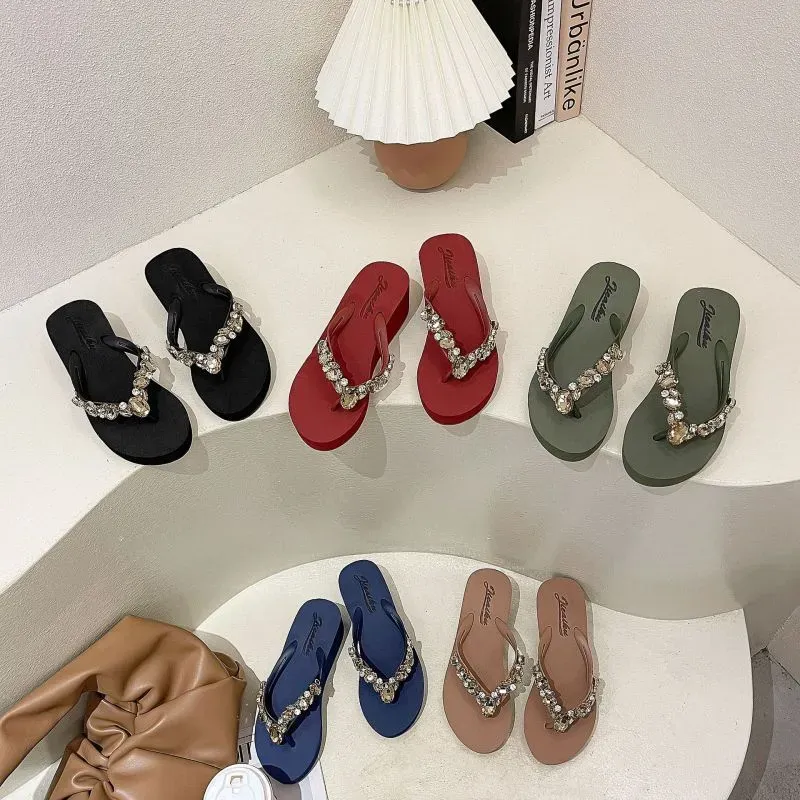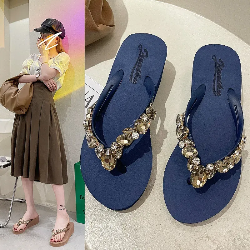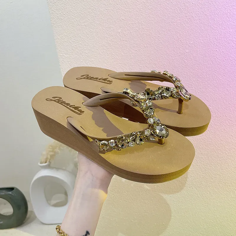 Women Summer Outer Wear Fashion Rhinestone Seaside Beach Platform Flip-Flops